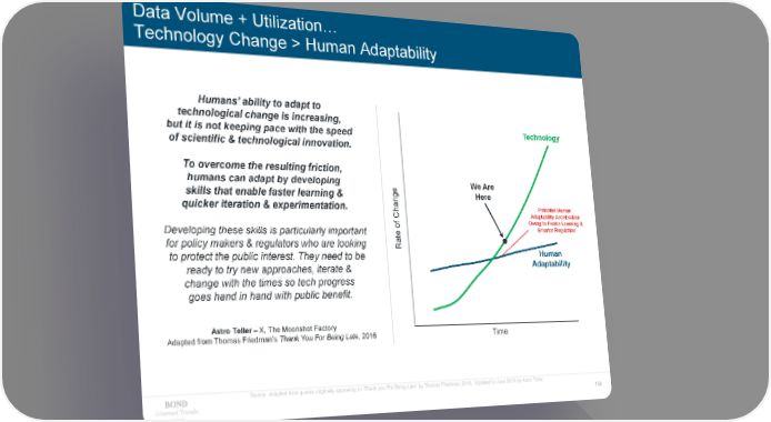 Data Volume + Utilization… Technology Change > Human Adaptability Humans’ ability to adapt to 14 technological change is increasing, Technology but it is not keeping pace with the speed 12 of scientific & technological innovation. To overcome the resulting friction, 10 humans can adapt by developing e We Are skills that enable faster learning & g Here quicker iteration & experimentation. n 8 Potential Human Cha Adaptability Acceleration f Owing to Faster Learning & o Developing these skills is particularly important 6 Smarter Regulation e for policy makers & regulators who are looking Rat to protect the public interest. They need to be 4 Human ready to try new approaches, iterate & Adaptability change with the times so tech progress goes hand in hand with public benefit. 2 Astro Teller – X, The Moonshot Factory 0 Adapted from Thomas Friedman’s Thank You For Being Late, 2016 Time Source: Adapted from quotes originally appearing in ‘Thank you For Being Late’ by Thomas Friedman, 2016. Updated in June 2019 by Astro Teller. Internet Trends 156 2019