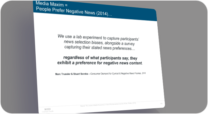 Media Maxim = People Prefer Negative News (2014)… We use a lab experiment to capture participants’ news selection biases, alongside a survey capturing their stated news preferences… regardless of what participants say, they exhibit a preference for negative news content. Marc Trussler & Stuart Soroka – Consumer Demand for Cynical & Negative News Frames, 3/14 Source: The Journal of Media Economics (11/14) & The International Journal of Press / Politics (12/15). Internet Trends 171 2019