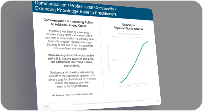 Communication / Professional Community = Extending Knowledge Base to Practitioners Communication = Increasing Ability Doximity = to Address Unique Cases Physician Social Network [A patient] was bitten by a Macaque Doximity Registered Members monkey & as a result, came down with a 1.2MM rare form of encephalitis. A potentially fatal brain inflammation. His physician used al Doximity to find one of the rare specialist ob l who could treat this condition. G , s r There are only about 20 doctors in the be em entire U.S. that are expert in this area. 0.6MM The patient was referred & treated tered M successfully. s Regi ty i m Most people don’t realize that referring i patients to the appropriate specialist isn’t Dox always easy for physicians & our network makes that process seamless, even in the toughest cases. 0 2011 2013 2015 2017 Jeff Tangney – CEO / Co-Founder, Doximity, 12/17 Source: Doximity (5/19), Thrive Global (12/17). Members include physicians, physician assistants, nurse practitioners & medical students. Internet Trends 282 2019