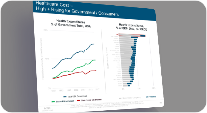 Healthcare Cost = High + Rising for Government / Consumers Health Expenditures Health Expenditures, % of Government Total, USA % of GDP, 2017, per OECD 30% USUSAA SWITZERLAND FRANCE GERMANY ture) SWEDEN i JAPAN nd ) CANADA pe AUSTRIA x DP THE NETHERLANDS E G l BELGIUM ota % of GREAT BRITAIN T ( FINLAND % of15% nd AUSTRALIA pe NEW ZEALAND S ITALY ture ( th i SPAIN nd Heal GREECE pe CHILE x KOREA E th ISRAEL HUNGARY Heal IRELAND CZECH REPUBLIC POLAND MEXICO 0% TURKEY 1987 1992 1997 2002 2007 2012 2017 0% 10% 20% Total USA Government Federal Government State / Local Government Government / Compulsory Voluntary Source: USA Federal + State & Local Healthcare expenditures per the Center for Medicare / Medicaid Studies. Total USA Government expenditures per USA Bureau of Economic Analysis Data. Total Health expenditure per OECD data includes all public / private healthcare Internet Trends spend for the year 2017 (some data subject to future revision per OECD). 292 2019