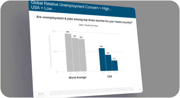 Global Relative Unemployment Concern = High… USA = Low… Are unemployment & jobs among top three worries for your home country? Ipsos / Reuters Surveys 40% 38% y 34% 33% el v i t osi P g 24% erin nsw 20% A 17% nts de 11% on esp R % 0% 2/17 3/18 3/19 2/17 3/18 3/19 World Average USA Source: Ipsos Survey Data of ~20K global respondents. Ipsos conducts this survey on a monthly basis, asking the same questions of a statistically representative sample of >1K people in 28 representative countries. February 2017 included owing to lack of published March 2017 report. World average reflects average of Germany, Israel, UK, USA, Belgium, Internet Trends Japan, Poland, Sweden, China, Hungary, Peru, Turkey, India, Australia, Canada, Mexico, Brazil, Russia, France, Argentina, Saudi Arabia, South Africa, South Korea, Italy & Spain. 215 2019