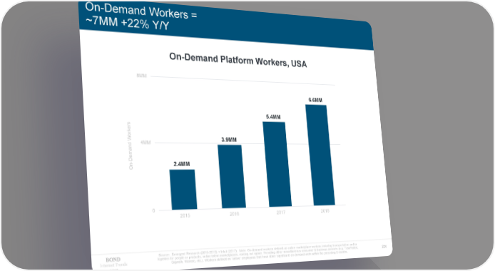 On-Demand Workers = ~7MM +22% Y/Y On-Demand Platform Workers, USA 8MM 6.6MM 5.4MM ers ork 3.9MM W 4MM d an Dem - 2.4MM On 0 2015 2016 2017 2018 Source: Emergent Research (2015-2018) + Intuit (2017). Note: On-demand workers defined as online marketplace workers including transportation and/or logistics for people or products, online talent marketplaces, renting out space. Providing other miscellaneous consumer & business services (e.g. TaskRabbit, Internet Trends Gigwalk, Wonolo, etc.). Workers defined as ‘active’ employees that have done ’significant’ on-demand work within the preceding 6 months. 224 2019