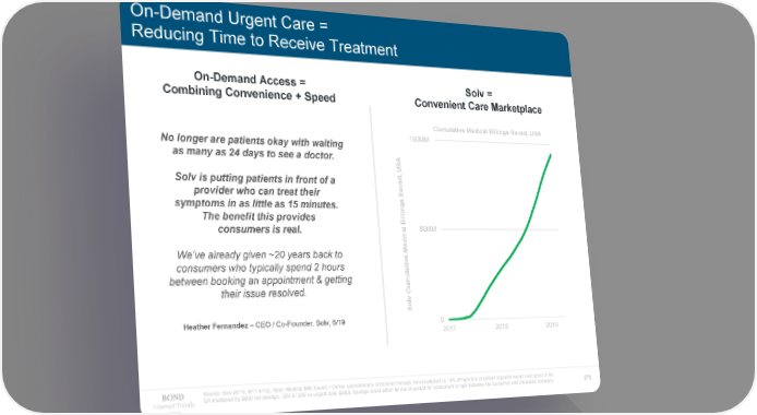 On-Demand Urgent Care = Reducing Time to Receive Treatment On-Demand Access = Solv = Combining Convenience + Speed Convenient Care Marketplace Cumulative Medical Billings Saved, USA No longer are patients okay with waiting 160MM as many as 24 days to see a doctor. A US d, Solv is putting patients in front of a e v provider who can treat their a S symptoms in as little as 15 minutes. s ng The benefit this provides li Bil consumers is real. l 80MM dica e M We’ve already given ~20 years back to e iv consumers who typically spend 2 hours t between booking an appointment & getting la their issue resolved. Cumu olv S Heather Fernandez – CEO / Co-Founder, Solv, 6/19 0 2017 2018 2019 Source: Solv (6/19, 6/17-5/19). Note: Medical Bills Saved = Online appointments scheduled through Solv multiplied by 14% (Proportion of patient reported would have gone to the Internet Trends ER multiplied by $800 net savings…ER $1,000 vs urgent care $200). Savings could either be out of pocket for consumers or split between the consumer and insurance company. 279 2019