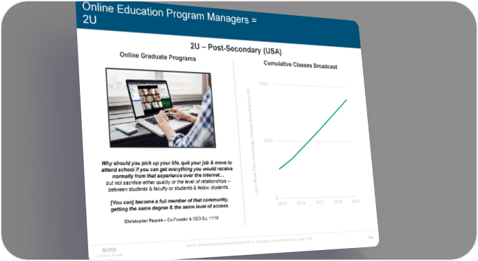 Online Education Program Managers = 2U 2U – Post-Secondary (USA) Online Graduate Programs Cumulative Classes Broadcast ds600K on 2Uan t us as ho oadc T Br es s as l C 300K ty i s er v ni U Why should you pick up your life, quit your job & move to e m attend school if you can get everything you would receive i T - normally from that experience over the Internet… l but not sacrifice either quality or the level of relationships – / Rea between students & faculty or students & fellow students. e v Li [You can] become a full member of that community, 0 getting the same degree & the same level of access. 2015 2016 2017 2018 2019 Christopher Paucek – Co-Founder & CEO 2U, 11/18 Source: Goldman Sachs Investment Research (5/18). Christopher Paucek Interview with Code (11/18). Internet Trends 242 2019