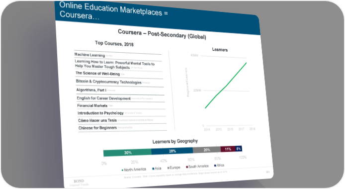 Online Education Marketplaces = Coursera… Coursera – Post-Secondary (Global) Top Courses, 2018 Learners 40MM Stanford Machine Learning Learning How to Learn: Powerful Mental Tools to s UC San Diego r Help You Master Tough Subjects e n r Yale a The Science of Well-Being e L Princeton d Bitcoin & Cryptocurrency Technologies e r te s Princeton i 20MM Algorithms, Part I g Re University of Pennsylvania English for Career Development Yale Financial Markets Introduction to Psychology University of Toronto Cómo Hacer una Tesis Universidad Nacional Autónoma de México Chinese for Beginners Peking University 0 2014 2015 2016 2017 2018 Learners by Geography 30% 28% 20% 11% 5% 0% 20% 40% 60% 80% 100% North America Asia Europe South America Africa Source: Coursera. Note: Course popularity based on average daily enrollments. Graph shows learners as of 12/18. Internet Trends 243 2019