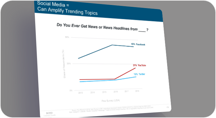 Social Media = Can Amplify Trending Topics Do You Ever Get News or News Headlines from ____ ? 50% 43% Facebook %) ( nts de on25% esp 21% YouTube R of e r 12% Twitter ha S 0% 2013 2014 2015 2016 2017 2018 Pew Survey (USA) Source: Pew Research (9/18). Note Survey = 4,581 respondents interviewed between 7/30/18 & 8/12/18 vs. historical data from 2016 & 2013. Note: Instagram / LinkedIn / Reddit / Snapchat / WhatsApp / Tumblr not shown owing to less than 10% of respondents using them to get news in 2018. Internet Trends 176 2019
