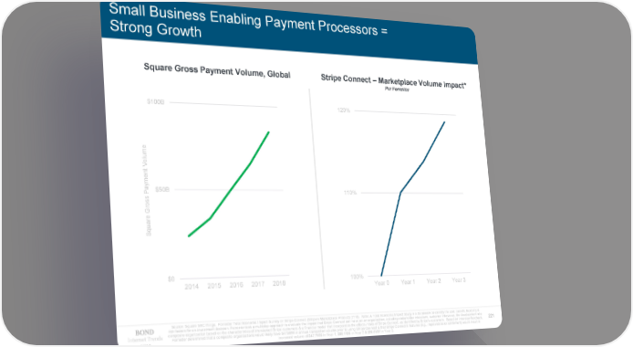 Small Business Enabling Payment Processors = Strong Growth Square Gross Payment Volume, Global Stripe Connect – Marketplace Volume Impact* Per Forrester $100B 120% +6.7% e um ol V t en m ay $50B 110% P s os r are G qu S $0 100% 2014 2015 2016 2017 2018 Year 0 Year 1 Year 2 Year 3 Source: Square SEC filings. Forrester Total Economic Impact Survey on Stripe Connect (Stripe’s Marketplace Product) (7/18). Note: A Total Economic Impact Study is a framework to identify the cost, benefit, flexibility & risk factors for an investment decision. Forrester took a multistep approach to evaluate the impact that Stripe Connect can have on an organization, including stakeholder interviews, customer interviews, the development of a Internet Trends composite organization based on the characteristics of interviewed Stripe customers & a financial model that incorporates the effects / risks of Stripe Connect, as identified by Stripe’s customers. Based on interview feedback, 221 Forrester determined that a composite organizations would likely have $475MM in annual transaction volume prior to using Stripe Connect & that Stripe Connect’s features (e.g., improved seller settlement) would result in 2019 increased volume of $47.7MM in Year 1, $66.1MM in Year 2 & $90.6MM in Year 3.