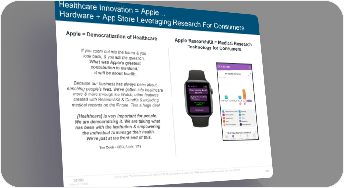 Healthcare Innovation = Apple… Hardware + App Store Leveraging Research For Consumers Apple = Democratization of Healthcare Apple ResearchKit = Medical Research Technology for Consumers If you zoom out into the future & you look back, & you ask the question, ‘What was Apple’s greatest contribution to mankind,’ it will be about health. Because our business has always been about enriching people’s lives. We’ve gotten into healthcare more & more through the Watch, other features created with ResearchKit & CareKit & including medical records on the iPhone. This a huge deal. [Healthcare] is very important for people. We are democratizing it. We are taking what has been with the institution & empowering the individual to manage their health. We’re just at the front end of this. Tim Cook – CEO, Apple, 1/19 Source: Apple. Tim Cook Interview with CNBC (1/19). Morgan Stanley estimates that 70MM Apple Watch units have been sold from 4/15-3/19. Internet Trends 288 2019
