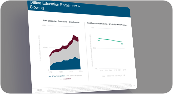 Offline Education Enrollment = Slowing Post-Secondary Education – Enrollments* Post-Secondary Students – % in Only Offline Courses 26MM 100% A US A , US es 74% , ts Cours 67% en m l ne i l f nrol 13MM f 50% O E te y nl O ng gradua i r ak T Unde ts en ud % St 0 0% 1970 1986 2002 2018 2012 2013 2014 2015 2016 2017 2 Year Undergraduate 4 Year Undergraduate Any Graduate Year = School Year Beginning in Fall Source: National Center for Education Statistics (3/18). 2017-2018 are estimates supplied by Chegg. *Note: Decline in Post-Secondary Students only taking offline courses partly driven by student demographics (e.g., an older student base more likely to be employed while at school). Data through 1995 are for institutions of higher education, while later data are for degree-granting institutions. Internet Trends Degree-granting institutions grant associate’s or higher degrees & participate in Title IV federal financial aid programs. The degree-granting classification is very similar to the earlier higher education 237 2019 classification, but it includes more 2-year colleges & excludes a few higher education institutions that did not grant degrees. Some data have been revised from previously published figures.