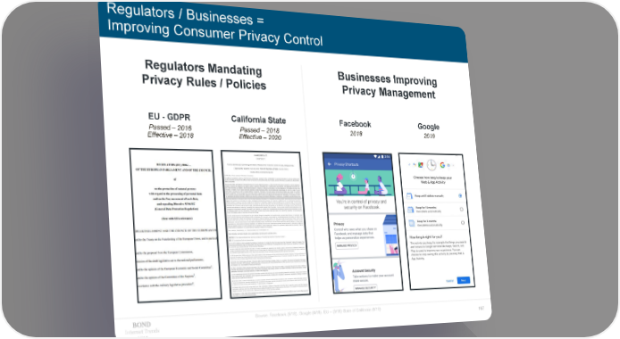 Regulators / Businesses = Improving Consumer Privacy Control Regulators Mandating Businesses Improving Privacy Rules / Policies Privacy Management EU - GDPR California State Facebook Google Passed – 2016 Passed – 2018 2018 2019 Effective – 2018 Effective – 2020 Source: Facebook (5/18). Google (4/18). EU – (3/18) State of California (6/18) Internet Trends 167 2019