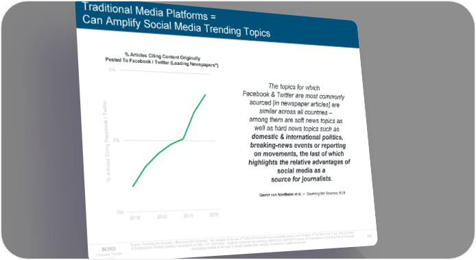 Traditional Media Platforms = Can Amplify Social Media Trending Topics % Articles Citing Content Originally Posted To Facebook / Twitter (Leading Newspapers*) 6% The topics for which Facebook & Twitter are most commonly er sourced [in newspaper articles] are t t i similar across all countries – Tw / among them are soft news topics as k well as hard news topics such as ceboo domestic & international politics, Fa 3% breaking-news events or reporting ng i t i on movements, the last of which C es highlights the relative advantages of cl i t r social media as a A % source for journalists. Gerret von Nordheim et al. – Sourcing the Sources, 6/18 0% 2010 2012 2014 2016 Source: Sourcing the Sources – Bournemouth University. *An analysis of the use of Twitter & Facebook as a journalistic source over 10 years in The New York Times, The Guardian, & Süddeutsche Zeitung (leading newspapers in USA / UK / Germany). Analysis conducted by collecting articles from 2006-2016 across all 3 newspapers & running natural language Internet Trends processing models on the text to identify articles that mention Facebook or Twitter as sources 177 2019