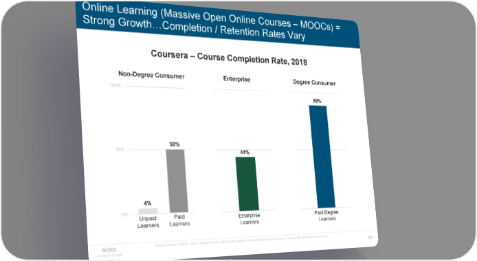 Online Learning (Massive Open Online Courses – MOOCs) = Strong Growth…Completion / Retention Rates Vary Coursera – Course Completion Rate, 2018 Non-Degree Consumer Enterprise Degree Consumer 100% 100% 100% 89% 50% 50% 50% 44% 50% 4% 0% Unpaid Paid 0% Enterprise 0% Paid Degree Free Paid Paid Paid Learners Learners Learners Learners Source: Coursera (6/19). Note: Completion rate refers to the number of students that finish a course vs. the number that began the course. Internet Trends 256 2019
