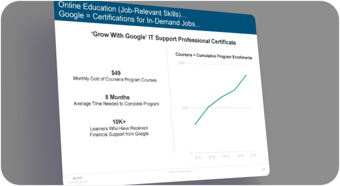 Online Education (Job-Relevant Skills)… Google = Certifications for In-Demand Jobs... ‘Grow With Google’ IT Support Professional Certificate Coursera = Cumulative Program Enrollments 120K $49 Monthly Cost of Coursera Program Courses 8 Months Average Time Needed to Complete Program 60K 10K+ Learners Who Have Received Financial Support from Google 0 3/18 6/18 9/18 12/18 3/19 Source: Coursera (6/19). Internet Trends 252 2019