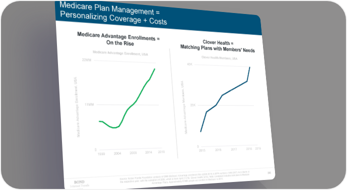 Medicare Plan Management = Personalizing Coverage + Costs Medicare Advantage Enrollments = Clover Health = On the Rise Matching Plans with Members’ Needs Medicare Advantage Enrollment, USA Clover Health Members, USA 22MM 40K A A t, US US , s en r m be l m nrol Me E 11MM e 20K e tag tag an an dv dv A A are are c c di di Me Me 0 0 1999 2004 2009 2014 2018 2015 2016 2017 2018 2019 Source: Kaiser Family Foundation analysis of CMS Medicare Advantage enrollment files (2008-2018) & MPR numbers (1999-2007) from March of Internet Trends the respective year, with the exception of 2006, which is from April (11/18). Clover Health (3/19). Note: Enrollment includes cost plans & Medicare 285 2019 Advantage Plans. Approximately 61MM people are enrolled in Medicare in 2018.