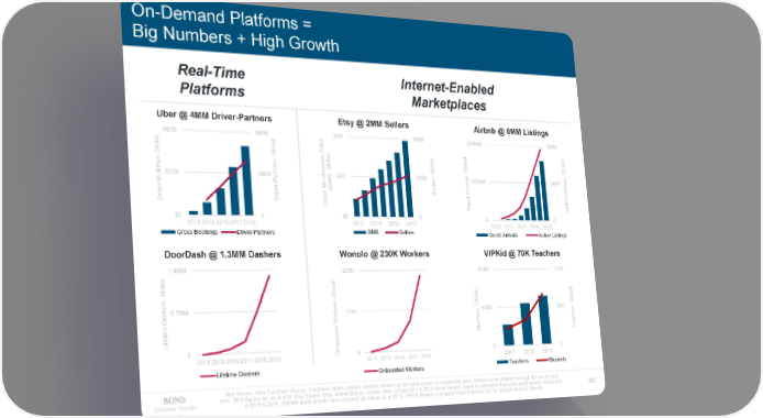 On-Demand Platforms = Big Numbers + High Growth Real-Time Internet-Enabled Platforms Marketplaces Uber @ 4MM Driver-Partners Etsy @ 2MM Sellers Airbnb @ 6MM Listings l $60B 6MM l $4B 4MM 250MM 6MM a a les b b a l S l l Glo a l a a Glo e a b , b b , s is b s r d Glo e n Glo Glo ing a Glo , n , , k t h ) , s o $30B 3MM r c S $2B 2MM s ls o a r r a125MM 3MM ing P e e iv t B - ll r r M GM e r is s ( A L s ive s S o s t e Dr o s iv Gr e t Gr c Gu A $0 0 $0 0 0 0 20142015201620172018 2012 2014 2016 2018 2010 2012 2014 2016 2018 Gross Bookings Driver-Partners GMS Sellers Guest Arrivals Active Listings DoorDash @ 1.3MMDashers Wonolo @ 230K Workers VIPKid @ 70K Teachers l 1.4MM l 250K 900K 110K a a b b l l Glo a a Glo , b b s , r s e r Glo Glo h 0.7MM e s k 125K , 450K 55K , a r s s o t r D n e W e h e d c im d u t e t e d S Tea if r L a o 0 b 201420152016201720182019 On 0 0 0 2014 2015 2016 2017 2018 2017 2018 2019 Lifetime Dashers Onboarded Workers Teachers Students Uber Source: Uber DoorDash Source: DoorDash. Note: Lifetime Dashers defined as the total number of people that have dashed on the platform through the end of each year. 2019 figures are as of 5/19. Etsy Source: Etsy. Airbnb Source: Airbnb, Note: Airbnb 2017 & 2018 Guest arrivals based on estimates from total guest arrivals disclosures Internet Trends in 2018 & 2019. 500MM guest arrivals have occurred via Airbnb as of 2019. VIPKid Source: Company Press Releases (3/19). Wonolo Source: Wonolo. 227 2019