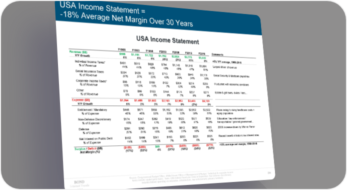 USA Income Statement = -18% Average Net Margin Over 30 Years USA Income Statement F1988 F1993 F1998 F2003 F2008 F2013 F2018 Comments Revenue ($B) $909 $1,154 $1,722 $1,782 $2,524 $2,775 $3,330 Y/Y Growth 6% 6% 9% (4%) (2%) 13% 0% +5% Y/Y average, 1988-2018 Individual Income Taxes* $401 $510 $829 $794 $1,146 $1,316 $1,684 Largest driver of revenue % of Revenue 44% 44% 48% 45% 45% 47% 51% Social Insurance Taxes $334 $428 $572 $713 $900 $948 $1,171 Social Security & Medicare payroll tax % of Revenue 37% 37% 33% 40% 36% 34% 35% Corporate Income Taxes* $95 $118 $189 $132 $304 $274 $205 Fluctuates with economic conditions % of Revenue 10% 10% 11% 7% 12% 10% 6% Other $79 $99 $133 $144 $174 $237 $271 Estate & gift taxes, duties / fees… % of Revenue 9% 9% 8% 8% 7% 9% 8% Expense ($B) $1,064 $1,409 $1,652 $2,160 $2,983 $3,455 $4,109 Y/Y Growth 6% 2% 3% 7% 9% (2%) 3% Entitlement / Mandatory $448 $671 $859 $1,182 $1,595 $2,032 $2,522 Risen owing to rising healthcare costs + % of Expense 42% 48% 52% 55% 53% 59% 61% aging population Non-Defense Discretionary $174 $247 $282 $419 $522 $577 $639 Education / law enforcement / % of Expense 16% 18% 17% 19% 18% 17% 16% transportation / general government… Defense $291 $292 $270 $405 $612 $626 $623 2008 increase driven by War on Terror % of Expense 27% 21% 16% 19% 21% 18% 15% Net Interest on Public Debt $152 $199 $241 $153 $253 $221 $325 Recent benefit of historic low interest rates % of Expense 14% 14% 15% 7% 8% 6% 8% Surplus / Deficit ($B) ($155) ($255) $69 ($378) ($459) ($680) ($779) -18% average net margin, 1988-2018 Net Margin (%) (17%) (22%) 4% (21%) (18%) (24%) (23%) Source: Congressional Budget Office, White House Office of Management & Budget. *Individual & corporate income taxes include capital gains taxes. Note: USA federal fiscal year ends in September. Non-defense discretionary Internet Trends includes federal spending on education, infrastructure, law enforcement, judiciary functions. 264 2019