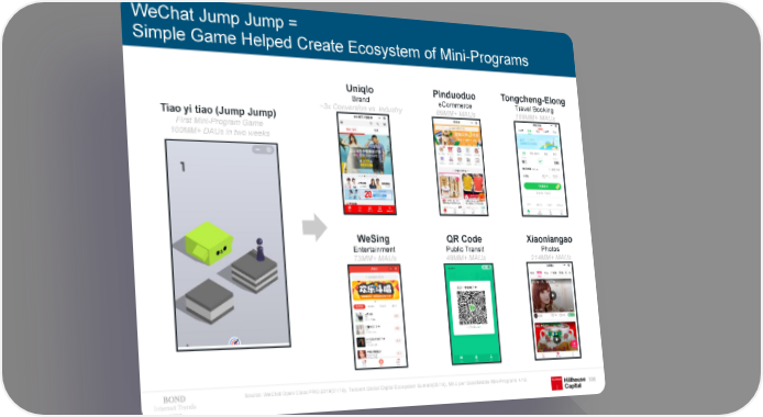 WeChat Jump Jump= Simple Game Helped Create Ecosystem of Mini-Programs Uniqlo Pinduoduo Tongcheng-Elong Brand eCommerce Travel Booking Tiao yi tiao (Jump Jump) ~3x Conversion vs. Industry 89MM+ MAUs 169MM+ MAUs First Mini-Program Game 100MM+ DAUs in two weeks WeSing QR Code Xiaoniangao Entertainment Public Transit Photos 73MM+ MAUs 48MM+ MAUs 214MM+ MAUs Source: WeChat Open Class PRO 2019(01/19), Tencent Global Digital Ecosystem Summit(05/19), MAU per QuestMobile Mini-Programs 4/19. Internet Trends 308 2019