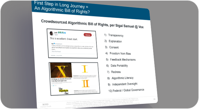 First Step in Long Journey = An Algorithmic Bill of Rights? Crowdsourced Algorithmic Bill of Rights, per Sigal Samuel @ Vox 1) Transparency 2) Explanation 3) Consent 4) Freedom from Bias 5) Feedback Mechanisms 6) Data Portability 7) Redress 8) Algorithmic Literacy 9) Independent Oversight 10) Federal / Global Governance Source: In early 2019, Vox reached out to 10 experts (including Kartik Hosanagar – original proposer of an Algorithmic Bill of Rights) at the forefront of investigating how Artificial Intelligence risk is creeping into multiple aspects of life. Vox reporter Sigal Samuel asked them each to Internet Trends 203 2019 name a protection the public needs enshrined in law, resulting in a crowdsourced, proposed Algorithmic Bill of Rights. Full detail available - https://www.vox.com/the-highlight/2019/5/22/18273284/ai-algorithmic-bill-of-rights-accountability-transparency-consent-bias
