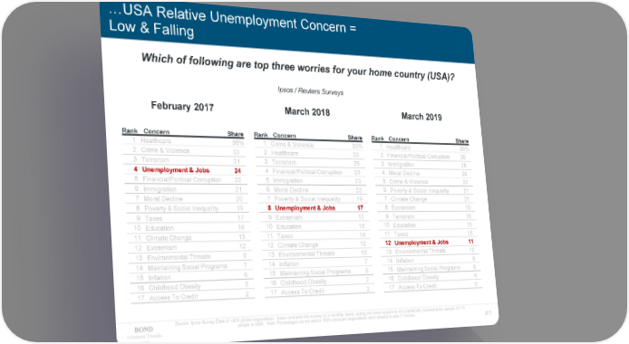 …USA Relative Unemployment Concern = Low & Falling Which of following are top three worries for your home country (USA)? Ipsos / Reuters Surveys February 2017 March 2018 March 2019 Rank Concern Share Rank Concern Share Rank Concern Share 1 Healthcare 36% 1 Crime & Violence 35% 1 Healthcare 39% 2 Crime & Violence 33% 2 Healthcare 33% 2 Financial/Political Corruption 28% 3 Terrorism 31% 3 Terrorism 29% 3 Immigration 28% 4 Unemployment & Jobs 24% 4 Financial/Political Corruption 23% 4 Moral Decline 26% 5 Financial/Political Corruption 22% 5 Immigration 23% 5 Crime & Violence 22% 6 Immigration 21% 6 Moral Decline 23% 6 Poverty & Social Inequality 21% 7 Moral Decline 20% 7 Poverty & Social Inequality 19% 7 Climate Change 21% 8 Poverty & Social Inequality 19% 8 Unemployment & Jobs 17% 8 Extremism 19% 9 Taxes 17% 9 Extremism 15% 9 Terrorism 18% 10 Education 16% 10 Education 15% 10 Education 15% 11 Climate Change 13% 11 Taxes 14% 11 Taxes 15% 12 Extremism 12% 12 Climate Change 12% 12 Unemployment & Jobs 11% 13 Environmental Threats 9% 13 Environmental Threats 10% 13 Environmental Threats 10% 14 Maintaining Social Programs 7% 14 Inflation 7% 14 Inflation 6% 15 Inflation 6% 15 Maintaining Social Programs 5% 15 Maintaining Social Programs 6% 16 Childhood Obesity 3% 16 Childhood Obesity 2% 16 Childhood Obesity 4% 17 Access To Credit 2% 17 Access To Credit 2% 17 Access To Credit 0% Source: Ipsos Survey Data of ~20K global respondents. Ipsos conducts this survey on a monthly basis, asking the same questions of a statistically representative sample of >1K people in USA. Note: Percentages do not add to 100% because respondents were allowed to pick 3 choices. Internet Trends 217 2019
