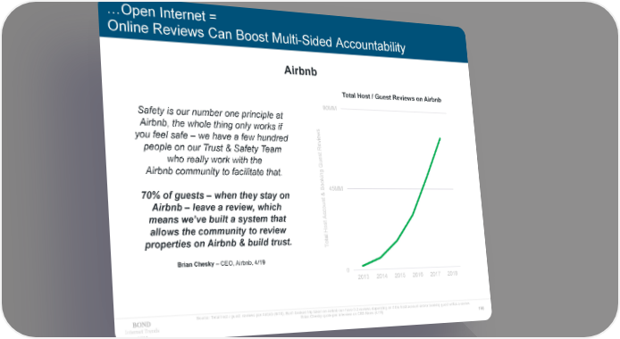 …Open Internet = Online Reviews Can Boost Multi-Sided Accountability Airbnb Total Host / Guest Reviews on Airbnb 90MM Safety is our number one principle at Airbnb, the whole thing only works if s ew you feel safe – we have a few hundred i people on our Trust & Safety Team Rev t s who really work with the ue G Airbnb community to facilitate that. ng i k oo45MM B 70% of guests – when they stay on & nt Airbnb – leave a review, which ou c means we’ve built a system that c t A allows the community to review Hos l properties on Airbnb & build trust. ota T Brian Chesky – CEO, Airbnb, 4/19 0 2013 2014 2015 2016 2017 2018 Source: Total host / guest reviews per Airbnb (6/19). Each booked trip taken on Airbnb can have 0-2 reviews depending on if the host account and/or booking guest writes a review. Brian Chesky quote per interview on CBS News (4/19) Internet Trends 196 2019