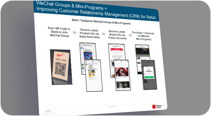 WeChat Groups & Mini-Programs = Improving Customer Relationship Management (CRM) for Retail Belle / TopSports WeChat Groups & Mini-Programs Scan QR Code in Receive Latest Receive Latest Purchase + Checkout Store to Join Product Info via Brand Info via via WeChat WeChat Group Sales Associates Public Accounts Mini Programs Source: Belle. Internet Trends 326 2019