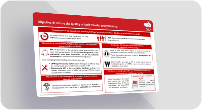 Objective 4: Ensure the quality of cash transfer programming The quality of CTP is perceived to be improving, but there is currently no common definition of what quality means for CTP 80% Practitioners believe that their organization has made 75% of practitioners believe they have the evidence they need to progress towards increasing the quality of CTP design quality CTP Common tools and standards, based on best practice, are required to Unrestricted CTP can promote choice and quality, manage quality consistently. but evidence is currently limited 81% of respondents to the practitioner survey agree that they know MPGs on their own cannot address all needs and should be about best practice tools for CTP. But CTP tools and guidance are not implementedincombinationwithotherprogrammeactivities systematically used across organizations, and are not sufficiently The use of unrestricted cash cuts to the heart of ‘putting people at the harmonizedwitheachotherorotherhumanitarianguidance centre’ of decision making There are ongoing initiatives to help address these issues, e.g. Determining the best ways for CTP to achieve sectoral outcomes, ▪ CBAProgrammeQuality Toolbox: Details the steps to be followed along including through the use of MPGs, requires constructive dialogue and the entire program cycle, in order to ensure quality of CTP collaboration across sectors ▪ Mainstreaming CTP in the new Sphere standards: Underpins the inherent multi-sector nature of MPGs and integrates CTP into relevant Effective monitoring requires the use of common indicators and sectoral technical standards processes across modalities and agencies The potential of humanitarian CTP to enhance financial inclusion Perceived lack of capacity in M&E for CTP depends on the context Greater harmoization of indicators 4/10 and outcomes can help enable Practitioners believe Whether financial inclusion should be an objective for CTP depends on comparative analyses of efficiency, humanitarian agencies have the nature of the crisis – specifically, its predictability and time horizon. effectiveness and accountability. appropriate M&E mechanisms This also needs to be resourced. in place for CTP. Copyright © CaLPand Accenture 2017. All rights reserved 10