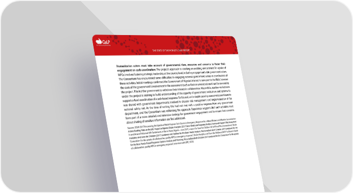 C The Cash Learning Partnership THE STATE OF THE WORLD’S CASH REPORT Humanitarian actors must take account of governmental time, resources and concerns to foster their engagement on cash coordination: The project’s approach to creating an enabling environment for uptake of MPGs involves fostering strategic leadership at the country level, including engagement with government actors. The Consortium has encountered some difficulties in engaging national government actors in coordination of these activities. Initial meetings confirmed the Government of Nigeria’s interest to take part in the BNA, however the costs of the government’s involvement in the assessment (such as their enumerators) could not be covered by the project. This led the government to withdraw their interest in collaboration. Meanwhile, another workstream under the project is seeking to build understanding of the capacity of government institutions and systems to support or lead coordination of a cash-based response. To this end, an in-depth capacity assessment questionnaire was shared with government departments involved in disaster risk management and implementation of the national safety net. At the time of writing this had not met with a positive response from any government department, and the Consortium was rethinking the approach. Experience suggests that such activities must form part of a more detailed and intensive strategy for government engagement and to ensure that concerns about sharing of sensitive information are first addressed. Sources: SCUK (2017) Increasing the Uptake of Multi-Purpose Cash Grants in Emergency Responses for a More Efficient and Effective Humanitarian Action: Briefing Note on the ERC Project in Nigeria; Okular Analytics (2017) Basic Needs and Response Analysis Framework Report: Pilot Assessment In and Around Informal IDPs Settlements in Borno State, Nigeria – June 2017, a report for Save the Children UK, WFP and Plan International; Okular Analytics and Save the Children (2017) Guidance and Toolbox for the Basic Needs Analysis, final unedited draft (October 2017) produced for the ‘Consortium for the uptake of collaborative, quality MPG in emergency response’; Okular Analytics and Save the Children (2017) Facilitator’s Guide for the Basic Needs-based Response Options Analysis and Planning, first unedited draft (October 2017) produced for the ‘Consortium for the uptake of collaborative, quality MPG in emergency response’; Interviews with DRC, SCUK. 127