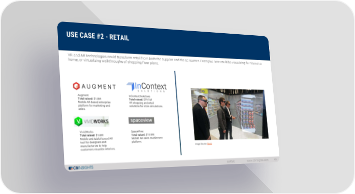 USE CASE #2 - RETAIL VR and AR technologies could transform retail from both the supplier and the consumer. Examples here could be visualizing furniture in a home, or virtualizing walkthroughs of shopping floor plans. Augment InContextSolutions Total raised: $1.8M Total raised: $19.9M Mobile AR-based enterprise VR shopping and retail platform for marketing and solutions for store simulations. sales. VividWorks SpaceView Total raised: $1.6M Total raised: $19.9M Mobile and tablet-based AR Mobile AR sales enablement tool for designers and platform. manufacturers to help Image Source: Barco customers visualize interiors. #ARVR www.cbinsights.com 49