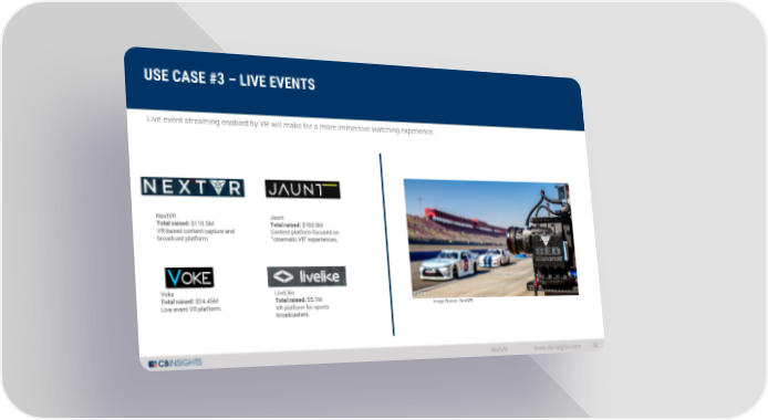 USE CASE #3 –LIVE EVENTS Live event streaming enabled by VR will make for a more immersive watching experience. NextVR Jaunt Total raised: $110.5M Total raised: $100.5M VR-based content capture and Content platform focused on broadcast platform. “cinematic VR” experiences. Voke LiveLike Total raised: $24.45M Total raised: $5.1M Image Source: NextVR Live event VR platform. VR platform for sports broadcasters. #ARVR www.cbinsights.com 50