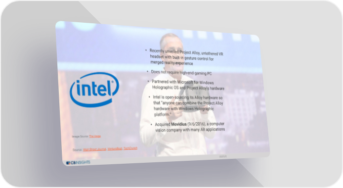 • Recently unveiled Project Alloy, untethered VR headset with built-in gesture control for merged reality experience • Does not require high-end gaming PC • Partnered with Microsoft for Windows Holographic OS and Project Alloy’s hardware • Intel is open-sourcing its Alloy hardware so that “anyone can combine the Project Alloy hardware with Windows Holographic platform.“ • Acquired Movidius (9/6/2016), a computer vision company with many AR applications ImageSource:TheVerge Source: Wall Street Journal, VentureBeat, TechCrunch @cbinsights #arvr #ARVR