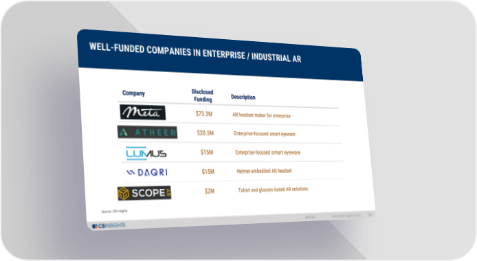 WELL-FUNDED COMPANIES IN ENTERPRISE / INDUSTRIAL AR Company Disclosed Description Funding $73.3M AR headset maker for enterprise $20.5M Enterprise-focused smart eyeware $15M Enterprise-focused smart eyeware $15M Helmet-embedded AR headset $2M Tablet and glasses-based AR solutions Source: CB Insights #ARVR www.cbinsights.com 56