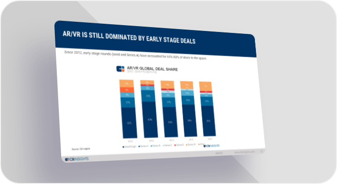 State of AR & VR Page 12 Page 14AR/VR IS STILL DOMINATED BY EARLY STAGE DEALS Since 2012, early stage rounds (seed and Series A) have accounted for 69%-83% of deals to the space. Source: CB Insights #ARVR www.cbinsights.com 12