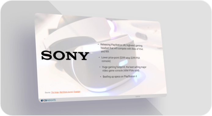 • Releasing PlayStation VR, high-end gaming headset that will compete with likes of Vive and Rift • Lower price-point ($399 atop $299 PS4 console) • Huge gaming footprint, the best selling major video game console (40M PS4s sold) • Beefing up specs on PlayStation 4 Source: The Verge, Wall Street Journal, Engadget @cbinsights #arvr #ARVR