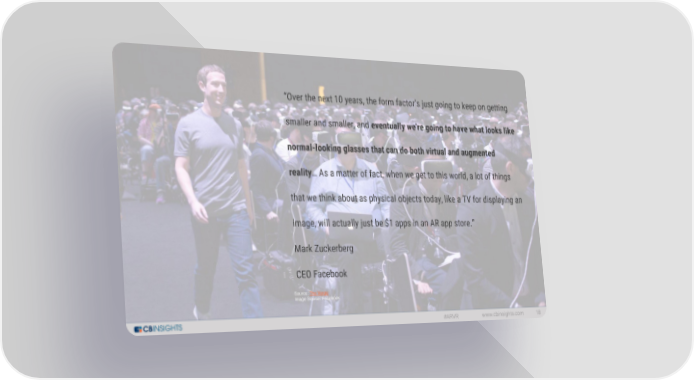 “Over the next 10 years, the form factor's just going to keep on getting smaller and smaller, and eventually we're going to have what looks like normal-looking glasses that can do both virtual and augmented reality… As a matter of fact, when we get to this world, a lot of things that we think about as physical objects today, like a TV for displaying an image, will actually just be $1 apps in an AR app store.” Mark Zuckerberg CEO Facebook Source: The Verge Image Source: Facebook #ARVR www.cbinsights.com 18