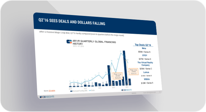 Q2’16 SEES DEALS AND DOLLARS FALLING After a massive Magic Leap deal, Q2’16 hardly compared (even to quarters before the mega-round). Top Deals Q2’16 Meta $50M // Series B OTOY $37M // Series D The Virtual Reality Company Magic Leap $23M // Series C $794M Lumus Magic Leap Series C $542M $15M // Series B Series B Within $13M // Series A Source: CB Insights #ARVR www.cbinsights.com 11