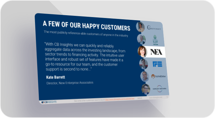 A FEW OF OUR HAPPY CUSTOMERS The most publicly reference-able customers of anyone in the industry “With CB Insights we can quickly and reliably aggregate data across the investing landscape, from sector trends to financing activity. The intuitive user interface and robust set of features have made it a go-to resource for our team, and the customer support is second to none...” Kate Barrett Director, New Enterprise Associates See what other customers have to say at http://www.cbinsights.com/customer-love #ARVR www.cbinsights.com 5