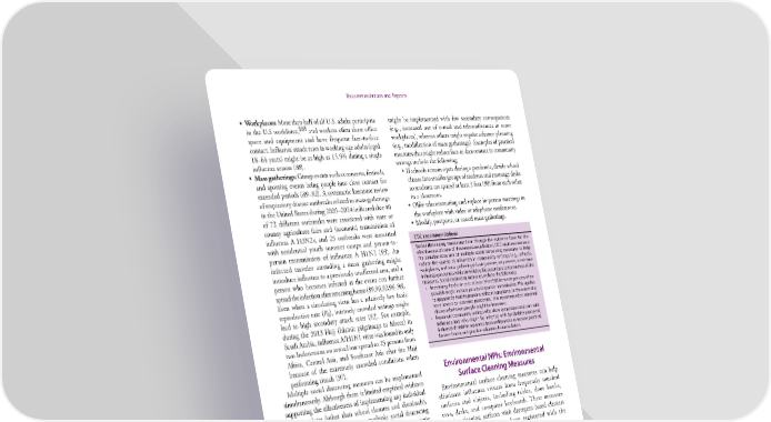 Recommendations and Reports • Workplaces: More than half of all U.S. adults participate might be implemented with few secondary consequences §§§ in the U.S workforce, and workers often share office (e.g., increased use of e-mail and teleconferences in some space and equipment and have frequent face-to-face workplaces), whereas others might require advance planning contact. Influenza attack rates in working-age adults (aged (e.g., modification of mass gatherings). Examples of practical 18–64 years) might be as high as 15.5% during a single measures that might reduce face-to-face contact in community influenza season (88). settings include the following: • Mass gatherings: Group events such as concerts, festivals, • If schools remain open during a pandemic, divide school and sporting events bring people into close contact for classes into smaller groups of students and rearrange desks extended periods (89–92). A systematic literature review so students are spaced at least 3 feet (98) from each other of respiratory disease outbreaks related to mass gatherings in a classroom. in the United States during 2005–2014 indicated that 40 • Offer telecommuting and replace in-person meetings in of 72 different outbreaks were associated with state or the workplace with video or telephone conferences. county agriculture fairs and (zoonotic) transmission of • Modify, postpone, or cancel mass gatherings. influenza A H3N2v, and 25 outbreaks were associated with residential youth summer camps and person-to- CDC recommendations person transmission of influenza A H1N1 (93). An Social distancing measures: Even though the evidence base for the effectiveness of some of these measures is limited, CDC might recommend infected traveler attending a mass gathering might the simultaneous use of multiple social distancing measures to help introduce influenza to a previously unaffected area, and a reduce the spread of influenza in community settings (e.g., schools, workplaces, and mass gatherings) during severe, very severe, or extreme person who becomes infected at the event can further influenza pandemics while minimizing the secondary consequences of the spread the infection after returning home (89,90,92,94–96). measures. Social distancing measures include the following: Even when a circulating virus has a relatively low basic • Increasing the distance to at least 3 feet (98) between persons when possible might reduce person-to person transmission. This applies reproductive rate (R ), intensely crowded settings might to apparently healthy persons without symptoms. In the event of a 0 very severe or extreme pandemic, this recommended minimal lead to high secondary attack rates (92). For example, distance between people might be increased. during the 2013 Hajj (Islamic pilgrimage to Mecca) in • Persons in community settings who show symptoms consistent with Saudi Arabia, influenza A/H1N1 virus was found in only influenza and who might be infected with (probable) pandemic influenza should be separated from well persons as soon as practical, two Indonesians on arrival but spread to 25 persons from be sent home, and practice voluntary home isolation. Africa, Central Asia, and Southeast Asia after the Hajj because of the extremely crowded conditions when performing rituals (97). Environmental NPIs: Environmental Multiple social distancing measures can be implemented Surface Cleaning Measures simultaneously. Although there is limited empirical evidence supporting the effectiveness of implementing any individual Environmental surface cleaning measures can help measure alone (other than school closures and dismissals), eliminate influenza viruses from frequently touched the evidence for implementing multiple social distancing surfaces and objects, including tables, door knobs, measures in combination with other NPIs includes systematic toys, desks, and computer keyboards. These measures literature reviews, historical analyses of the 1918 pandemic, involve cleaning surfaces with detergent-based cleaners and mathematical modeling studies (supplementary Chapter 3 or disinfectants that have been registered with the https://stacks.cdc.gov/view/cdc/44313 and supplementary Environmental Protection Agency.¶¶¶ Appendix 5 https://stacks.cdc.gov/view/cdc/44314). Rationale for use as a public health strategy. Although the Settings and use. Social distancing measures can be percentage of influenza cases involving contact transmission implemented in a range of community settings, including (i.e., hand transfer of virus from contaminated objects to the educational facilities, workplaces, and public places where eyes, nose, or mouth) is unknown, this mode of transmission is a people gather (e.g., parks, religious institutions, theaters, and recognized route of virus spread (99). The routine use of cleaning sports arenas). The choice of social distancing measure depends measures that eliminate viruses from contaminated surfaces on the severity of the pandemic (Table 10). Certain measures might reduce the spread of influenza viruses (supplementary Chapter 3 https://stacks.cdc.gov/view/cdc/44313). §§§ As of September 2016, the U.S. workforce included 62.9% of the civilian, noninstitutionalized population aged ≥16 years (Source: US Bureau of Labor ¶¶¶ Antimicrobial products registered for use against H1N1 influenza and other Statistics. The employment situation—September 2016. Washington, DC: influenza A viruses on hard surfaces (https://archive.epa.gov/pesticides/ US Department of Labor; 2016. https://www.bls.gov/news.release/archives/ oppad001/web/pdf/influenza-a-product-list.pdf). empsit_10072016.pdf). 18 MMWR / April 21, 2017 / Vol. 66 / No. 1 US Department of Health and Human Services/Centers for Disease Control and Prevention