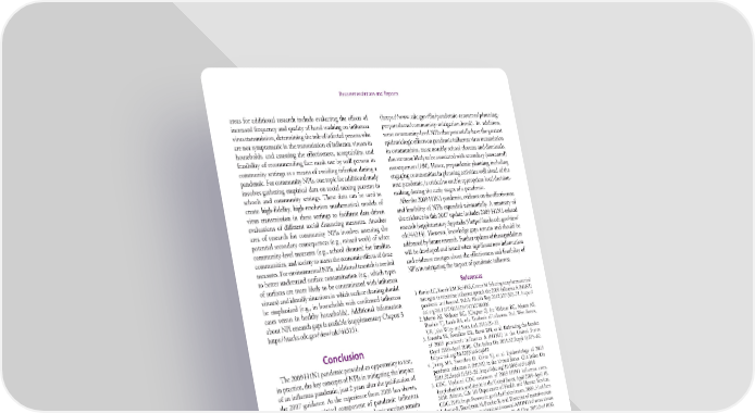 Recommendations and Reports areas for additional research include evaluating the effects of (https://www.cdc.gov/flu/pandemic-resources/planning- increased frequency and quality of hand washing on influenza preparedness/community-mitigation.html). In addition, virus transmission, determining the role of infected persons who some community-level NPIs that potentially have the greatest are not symptomatic in the transmission of influenza viruses in epidemiologic effects on pandemic influenza virus transmission households, and assessing the effectiveness, acceptability, and in communities, most notably school closures and dismissals, feasibility of recommending face mask use by well persons in also are most likely to be associated with secondary (unwanted) community settings as a means of avoiding infection during a consequences (104). Hence, prepandemic planning, including pandemic. For community NPIs, one topic for additional study engaging communities in planning activities well ahead of the involves gathering empirical data on social mixing patterns in next pandemic, is critical to enable appropriate local decision- schools and community settings. These data can be used to making during the early stages of a pandemic. create high-fidelity, high-resolution mathematical models of After the 2009 H1N1 pandemic, evidence on the effectiveness virus transmission in these settings to facilitate data-driven and feasibility of NPIs expanded substantially. A summary of evaluations of different social distancing measures. Another the evidence in this 2017 update includes 2009 H1N1-related area of research for community NPIs involves assessing the research (supplementary Appendix 5 https://stacks.cdc.gov/view/ potential secondary consequences (e.g., missed work) of select cdc/44314). However, knowledge gaps remain and should be community-level measures (e.g., school closures) for families, addressed by future research. Further updates of these guidelines communities, and society to assess the economic effects of these will be developed and issued when significant new information measures. For environmental NPIs, additional research is needed and evidence emerges about the effectiveness and feasibility of to better understand surface contamination (e.g., which types NPIs in mitigating the impact of pandemic influenza. of surfaces are more likely to be contaminated with influenza viruses) and identify situations in which surface cleaning should References be emphasized (e.g., in households with confirmed influenza 1. Barrios LC, Koonin LM, Kohl KS, Cetron M. Selecting nonpharmaceutical cases versus in healthy households). Additional information strategies to minimize influenza spread: the 2009 influenza A (H1N1) pandemic and beyond. Public Health Rep 2012;127:565–71. https:// about NPI research gaps is available (supplementary Chapter 3 doi.org/10.1177/003335491212700606 https://stacks.cdc.gov/view/cdc/44313). 2. Monto AS, Webster RG. [Chapter 2]. In: Webster RG, Monto AS, Braciale TJ, Lamb RA, eds. Textbook of influenza. 2nd. West Sussex, UK: John Wiley and Sons, Ltd; 2013:20–33. 3. Shrestha SS, Swerdlow DL, Borse RH, et al. Estimating the burden Conclusion of 2009 pandemic influenza A (H1N1) in the United States (April 2009–April 2010). Clin Infect Dis 2011;52(Suppl 1):S75–82. The 2009 H1N1 pandemic provided an opportunity to test, https://doi.org/10.1093/cid/ciq012 in practice, the key concepts of NPIs in mitigating the impact 4. Jhung MA, Swerdlow D, Olsen SJ, et al. Epidemiology of 2009 of an influenza pandemic, just 2 years after the publication of pandemic influenza A (H1N1) in the United States. Clin Infect Dis the 2007 guidance. As the experience from 2009 has shown, 2011;52(Suppl 1):S13–26. https://doi.org/10.1093/cid/ciq008 5. CDC. Updated CDC estimates of 2009 H1N1 influenza cases, NPIs can be a critical component of pandemic influenza hospitalizations, and deaths in the United States, April 2009–April 10, mitigation. Although well-matched pandemic vaccines remain 2010. Atlanta, GA: US Department of Health and Human Services, the main tool in reducing the risk of acquiring infection and in CDC; 2010. https://www.cdc.gov/h1n1flu/estimates_2009_h1n1.htm 6. Labrosse B, Tourdjman M, Porcher R, et al. Detection of extensive cross- controlling the spread of a pandemic virus, vaccines might not neutralization between pandemic and seasonal A/H1N1 influenza viruses be widely available for up to 6 months after the emergence of using a pseudotype neutralization assay. PLoS One 2010;5:e11036. a pandemic influenza virus, given current vaccine production https://doi.org/10.1371/journal.pone.0011036 7. Nougairède A, Ninove L, Zandotti C, et al. Novel virus influenza A technology. Furthermore, as during the 2009 H1N1 pandemic, (H1N1sw) in South-Eastern France, April–August 2009. PLoS One antiviral medications might be prioritized for treatment but 2010;5:e9214. https://doi.org/10.1371/journal.pone.0009214 not used for widespread chemoprophylaxis because of concerns 8. CDC. Use of influenza A (H1N1) 2009 monovalent vaccine: about antiviral resistance and limited stockpiles of antiviral recommendations of the Advisory Committee on Immunization Practices (ACIP), 2009. MMWR Recomm Rep 2009;58(No. RR-10). medications. Therefore, NPIs might be the only prevention 9. Fell DB, Sprague AE, Liu N, et al; Better Outcomes Registry & Network tools readily available for persons and communities to help (BORN) Ontario. H1N1 influenza vaccination during pregnancy and slow transmission of an influenza virus during the initial fetal and neonatal outcomes. Am J Public Health 2012;102:e33–40. https://doi.org/10.2105/AJPH.2011.300606 stages of a pandemic. However, individual NPIs might be only 10. Richards JL, Hansen C, Bredfeldt C, et al. Neonatal outcomes after partially effective in limiting community transmission when antenatal influenza immunization during the 2009 H1N1 influenza implemented alone. Thus, 