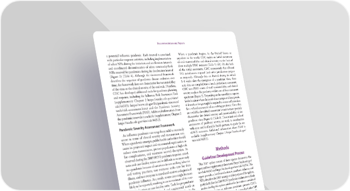 Recommendations and Reports a potential influenza pandemic. Each interval is associated When a pandemic begins, in the United States or with particular response activities, including implementation anywhere in the world, CDC makes an initial assessment of select NPIs during the initiation and acceleration intervals of viral transmissibility and clinical severity on the basis of and coordinated discontinuation of select community-level these multiple PSAF measures (Table 5) (44). On the basis NPIs reserved for pandemics during the deceleration interval of the initial assessment, CDC recommends that affected (Figure 2) (Table 4). Although the six-interval framework U.S. jurisdictions respond (and other jurisdictions prepare describes the sequence of pandemic disease evolution over to respond). Although data are limited during the initial time, the framework does not characterize the transmissibility 3–4 weeks after the emergence of a pandemic virus, these of the virus or the clinical severity of the outbreak. Therefore, early data are compiled into a broad, preliminary assessment. CDC has developed additional tools for pandemic planning CDC uses PSAF scores of viral transmissibility and clinical and response, including the Influenza Risk Assessment Tool severity to place the pandemic within one of four assessment (supplementary Chapter 2 https://stacks.cdc.gov/view/ quadrants (Figure 3). Depending on the surveillance capacity cdc/44313); https://www.cdc.gov/flu/pandemic-resources/ in the location where the novel virus emerges and first spreads, tools/risk-assessment.htm) and the Pandemic Severity 4–8 weeks or longer might be required to accrue sufficient data Assessment Framework (PSAF). Additional information about for a refined assessment of an evolving pandemic. Once data the pandemic intervals is available (supplementary Chapter 2 are available, the refined assessment is used to more precisely https://stacks.cdc.gov/view/cdc/44313). characterize the clinical severity and transmissibility of the Pandemic Severity Assessment Framework pandemic virus (Figure 4) (Table 6). These initial and refined assessments of pandemic severity are used, in coordination An influenza pandemic can range from mild to extremely with state and local public health partners, to guide the use severe in terms of clinical severity and transmission rate. of NPI measures. Additional information about PSAF is When a pandemic emerges, public health authorities should available (supplementary Chapter 2 https://stacks.cdc.gov/ assess its projected impact and recommend rapid action to view/cdc/44313). reduce virus transmission, protect populations at high risk for complications, and minimize societal disruption. As observed during the 2009 H1N1 pandemic response, attack Methods rates and case-fatality ratios can be difficult to measure early in a pandemic because of variations in care-seeking behavior Guidelines Development Process and testing practices; not everyone seeks care for their This 2017 update consists of three separate documents: this illness, and not everyone is tested and receives a diagnosis of report and two supplementary documents (https://stacks.cdc.gov/ pandemic influenza. As a result, severe cases might be more view/cdc/44313 and https://stacks.cdc.gov/view/cdc/44314). This likely to be reported, resulting in an overestimate of the case- report provides a brief introduction to pandemic influenza and hospitalization or case-fatality ratio. Tools for prepandemic NPIs; describes the 2007 strategy and the purpose of the updates, planning have been updated and augmented based on particularly after the 2009 H1N1 pandemic; outlines the methods that experience, and the Pandemic Severity Index in the used to develop this update and describe the evidence considered 2007 guidance has been replaced with PSAF. PSAF uses for NPI use during an influenza pandemic; presents CDC’s multiple clinical and epidemiologic indicators to provide NPI recommendations; and discusses key areas for further NPI a more comprehensive assessment of the transmissibility research. The two supplementary documents contain more specific and clinical severity of an emerging pandemic. Whereas and detailed information about pandemic influenza and NPIs. the Pandemic Severity Index was based on the assumption One document (Technical Report 1 https://stacks.cdc.gov/view/ that a future pandemic would cause an illness rate of 30% cdc/44313) is divided into chapters and provides an introduction in the U.S. population and relied on an assessment of case- to and overview of NPIs, a description of the new tools developed fatality ratios to determine severity of an evolving pandemic, for pandemic influenza planning and assessment, and a toolbox PSAF incorporates multiple measures of clinical severity describing the NPI evidence base, implementation issues, and (e.g., case-fatality ratios, case-hospitalization ratios, and research gaps. The second document (Technical Report 2 https:// deaths-hospitalizations ratios) and viral transmissibility stacks.cdc.gov/view/cdc/44314) consists of several appendices that (e.g., secondary household attack rates, school attack provide a glossary of terms, a detailed description of the methods rates, workplace attack rates, community attack rates, or used for developing the NPI recommendations, a comprehensive all of these, as well as rates of emergency department and summary table of the NPI body of evidence, and a list of tools outpatient visits for ILI) (44). and resources for pandemic influenza planning and preparedness. US Department of Health and Human Services/Centers for Disease Control and Prevention MMWR / April 21, 2017 / Vol. 66 / No. 1 9