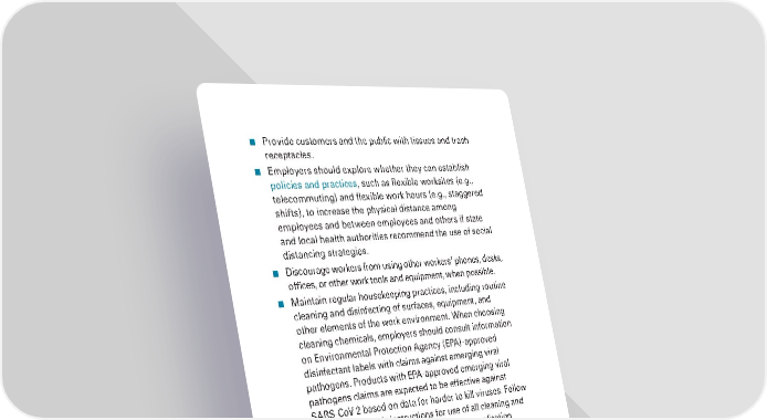 ■ Provide customers and the public with tissues and trash receptacles. ■ Employers should explore whether they can establish policies and practices, such as flexible worksites (e.g., telecommuting) and flexible work hours (e.g., staggered shifts), to increase the physical distance among employees and between employees and others if state and local health authorities recommend the use of social distancing strategies. ■ Discourage workers from using other workers’ phones, desks, offices, or other work tools and equipment, when possible. ■ Maintain regular housekeeping practices, including routine cleaning and disinfecting of surfaces, equipment, and other elements of the work environment. When choosing cleaning chemicals, employers should consult information on Environmental Protection Agency (EPA)-approved disinfectant labels with claims against emerging viral pathogens. Products with EPA-approved emerging viral pathogens claims are expected to be effective against SARS-CoV-2 based on data for harder to kill viruses. Follow the manufacturer’s instructions for use of all cleaning and disinfection products (e.g., concentration, application method and contact time, PPE). Develop Policies and Procedures for Prompt Identification and Isolation of Sick People, if Appropriate ■ Prompt identification and isolation of potentially infectious individuals is a critical step in protecting workers, customers, visitors, and others at a worksite. ■ Employers should inform and encourage employees to self-monitor for signs and symptoms of COVID-19 if they suspect possible exposure. ■ Employers should develop policies and procedures for employees to report when they are sick or experiencing symptoms of COVID-19. GUIDANCE ON PREPARING WORKPLACES FOR COVID-19 9