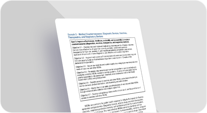 Domain 3 – Medical Countermeasures: Diagnostic Devices, Vaccines, Therapeutics, and Respiratory Devices Goal 3: Improve effectiveness, timeliness, availability and accessibility to medical countermeasures (diagnostics, vaccines, therapeutics, and respiratory devices). Objective 3 .1 – Develop new and improved medical countermeasures for influenza: vaccines that are more effective for all ages than currently available; novel broad-spectrum therapeutics for high-risk, severely ill, and hospitalized patients and pediatric populations; rapid point-of-care and in-home diagnostics; and effective and reusable respirators. Objective 3.2 – Augment and sustain sufficient domestic influenza vaccine manufacturing and fill/finish capacity to deliver finished doses of pandemic vaccine within 12 weeks of the declaration of a pandemic. Objective 3.3 – Secure raw materials and sustain supply chain integrity to meet the production needs of vaccines and other MCMs. Objective 3.4 – Re-assess requirements and maintain pre-pandemic vaccine and adjuvant stockpiles and other MCMs needed to combat pandemic influenza while strengthening the underlying pandemic risk-assessment infrastructure in collaboration with United States Government (USG) and global partners. .5 – Expedite access to vaccines and other MCMs, and enhance the ability to Objective 3 monitor demand, product distribution, and dispensing and administration. Objective 3 .6 – Monitor the clinical safety and effectiveness of vaccines and other MCMs through enhanced data collection and analysis capabilities. Objective 3 .7 – Develop and update guidance on the clinical use of, and the prioritization of access to vaccines and other MCMs. MCMs are central to the public health response to mitigate the impact of influenza epidemics and pandemics. Diagnostic devices, antiviral drugs and other therapeutics, vaccines, respiratory protective devices, and ventilators provide the means to detect, prevent, or treat influenza. The most effective MCMs cannot be identified until the characteristics of the pandemic virus are known: its transmissibility, virulence, antigenic properties, and susceptibility and clinical responsiveness to antiviral drugs. Vaccination is the most effective medical intervention for mitigating the potentially devastating impact of an evolving pandemic. This requires developing a well-matched, safe, and effective vaccine in the shortest time possible, and promptly making it available to the public. Shortening the time between detection of pandemic influenza viruses and widespread distribution of vaccine to cover the U.S. population (currently within about six months) is a priority for HHS and its partners. Planning efforts for implementing MCMs in the event of an influenza pandemic are Public Health Emergency Medical Countermeasures Enterprise a part of the USG-wide (PHEMCE) process to increase public health preparedness. HHS leads the federal departments and agencies involved in use of MCMs to protect the civilian population. PHEMCE’s mission areas include describing and defining the characteristics of MCMs identified through basic research; discovery and early product development; advanced 21
