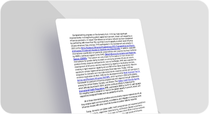 Complementing progress on the domestic front, HHS has made significant improvements in strengthening global capacities to prevent, detect, and respond to an influenza pandemic. A robust international surveillance network has been established by partnering with more than fifty countries to build capacity to detect novel influenza viruses wherever they emerge. HHS participated in the development and adoption in 2011 of the WHO Pandemic Influenza Preparedness (PIP) Framework for the Sharing of Influenza Viruses and Access to Vaccines and Other Benefits. In addition, expanded international coordination on pandemic preparedness and response has been facilitated Global Influenza Surveillance and Response by HHS’s continued support to the WHO System (GISRS). This system not only allows for the capture of more viruses from more places for greater ability to detect an emerging pandemic threat, but also to produce timely seasonal and pandemic vaccine candidates. HHS also supported the development of influenza vaccine manufacturing capacity in developing countries, creating a rapid response capability of over 500 million doses of pandemic influenza vaccine in remote regions where previously there was none. Finally, HHS has integrated its domestic and international pandemic response policies and operations to minimize duplication of effort. HHS led the development of the North American Plan for Animal and Pandemic Influenza (NAPAPI), which launched in 2012 as the primary framework for pandemic influenza preparedness and response through collaboration among the United States, Canada, and Mexico. The Global Health Security Agenda, which officially launched in 2014, and the continued efforts to implement the International Health Regulations (IHR), published in 2005 by the WHO, both highlight the ongoing need to establish or improve the global capacity to prevent, detect, and respond to biological threats such as pandemic influenza. All of these international activities serve to directly improve national security as they enable rapid communications, surveillance, and mitigation of emerging novel influenza viruses with other countries to ensure a better national response. Today, domestic and global public health preparedness and response benefit from improved products, responsive manufacturing, and broader disease surveillance. However, much remains to be done even as these critical efforts must be sustained. This 2017 Update describes HHS’s progress over the past decade of influenza response activities and the critical objectives for the decade ahead. 9