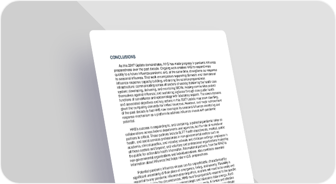 CONCLUSIONS As this 2017 Update demonstrates, HHS has made progress in pandemic influenza preparedness over the past decade. Ongoing work enables HHS to respond more quickly to a future influenza pandemic and, at the same time, strengthens our response to seasonal influenza. That work encompasses supporting domestic and international influenza response capacity building; enhancing the science preparedness infrastructure; communicating across all sectors of society; bolstering the health care system; developing, delivering, and monitoring MCMs; helping communities protect themselves against influenza; and sustaining vigilance through core public health functions of surveillance and epidemiology with laboratory support. The seven domains and associated objectives and key actions in this 2017 Update may seem daunting, given the competing demands for limited resources. However, one major achievement of the past decade is that HHS now leverages its seasonal influenza monitoring and response mechanism as a platform to address influenza viruses with pandemic potential. HHS’s success in responding to, and containing, a potential pandemic relies on collaborations across federal departments and agencies, but the role of nonfederal partners is critical. Those partners include SLTT health departments; medical, public health, and social services professionals in non-governmental sectors such as academia, clinical practice, and industry; schools and childcare settings; employers in all these sectors and beyond; and voluntary and professional organizations trusted by the public for actionable health information. International partners, from the WHO to ividual nations, also contribute essential non-governmental organizations and ind information about influenza that helps inform U.S. preparedness. Potential pandemic influenza viruses can be unpredictable, characterized by significant uncertainty of their place of emergence, timing, and severity. Flexibility is essential to any pandemic influenza planning effort, as plans will need to be easily and quickly adapted to the circumstances. HHS must be prepared to respond to the specific needs of an evolving pandemic, as epidemiologic and laboratory data emerge. Each response is different, even if the same basic principles apply. A nimble and effective pandemic response with flexible, sustainable capabilities will save lives and mitigate social and economic disruption. Finally, this 2017 Update illustrates the status of work as of April 2017. While the threat of pandemic influenza remains constant, the time needed to mount an effective response will not. Pandemic preparedness must be twofold—maintaining the gains that HHS has achieved over the last decade while improving scientific understanding of influenza and the tools to best fight it. As new scientific knowledge and applications evolve, the information linked to this Update will reflect that progress, and concrete strategies and measures for future progress can be developed. Given the continuous threat of an influenza pandemic, HHS will revisit the goals, objectives, and strategies as knowledge expands about preparing for, responding to, and recovering from an influenza pandemic. 40