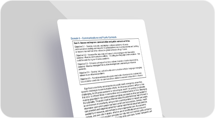 Domain 5 – Communications and Public Outreach Goal 5: Assess and improve communication and public outreach activities. Objective 5 .1 – Develop, evaluate, and deploy a national pandemic influenza communications strategy and expand it to global partners as circumstances warrant, building on lessons learned from other national or global outbreaks of significance. Objective 5 .2 – Increase the resources and capacity of core program staff devoted to seasonal influenza communications efforts – including plain language communications – that could be used during an influenza pandemic. .3 – Enhance and expand communications channels critical to disseminating Objective 5 seasonal influenza messages that could be leveraged and used during an influenza pandemic. Objective 5 .4 – Develop, test, and refine risk communication and plain language messaging relevant to an influenza pandemic. Objective 5 .5 – Formalize and expand a government-wide influenza communications task force to better coordinate risk communications related to seasonal and pandemic influenza. Significant uncertainty accompanies any public health emergency, presenting dynamic challenges to communication efforts. An influenza pandemic will be no less challenging. An influenza pandemic is not a singular event: it is a series of outbreaks that occur at different times in communities over a sustained period of time. Messaging must be grounded in risk communication principles and based on time and location of the outbreaks. The public must be informed about the potential threat, kept informed in an environment of uncertainty, and provided a solid foundation of relevant and usable information upon which people can base current and future actions. Similarly, health care providers and response personnel must be kept informed about best practices, availability of resources, and methods to ensure appropriate care. As a pandemic evolves, and even after it abates, effective use of scientifically derived crisis and emergency risk communication principles can help instill and maintain public confidence in the nation’s public health system. Success relies upon open, honest, transparent, and clear communications grounded in those principles. Throughout a pandemic, the public, news media, health care providers, international partners, and other groups will demand easy-to-understand information on how to respond appropriately to reduce the risk of getting or spreading influenza. Early in the pandemic, prevention and mitigation messages—with an emphasis on NPIs—will have to be conveyed despite incomplete information. Subsequent, ongoing communications amid rapidly expanding knowledge about the particular threat will challenge even the most highly skilled communications efforts. Messages will have to evolve with the pandemic, as vaccines and other MCMs become available, and as the case numbers and geographic spread expand. Messages will also need to be conveyed regarding counterfeit products and fraudulent or exaggerated product claims, particularly for products advertised or made available over the internet. Furthermore, behavioral health and stress reactions are health risks in a pandemic that must be integrated into 30