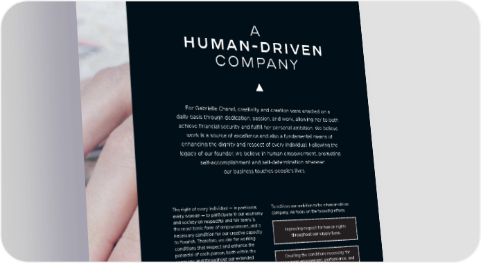 REPORT TO SOCIETY A HUMAN-DRIVEN COMPANY For Gabrielle Chanel, creativity and creation were enacted on a daily basis through dedication, passion, and work, allowing her to both achieve financial security and fulfill her personal ambition. We believe work is a source of excellence and also a fundamental means of enhancing the dignity and respect of every individual. Following the legacy of our founder, we believe in human empowerment, promoting self-accomplishment and self-determination wherever our business touches people’s lives. The right of every individual — in particular, To achieve our ambition to be a human-driven every woman — to participate in our economy company, we focus on the following efforts: and society on respectful and fair terms is the most basic form of empowerment, and a necessary condition for our creative capacity Improving respect for human rights to flourish. Therefore, we aim for working throughout our supply base. conditions that respect and enhance the potential of each person, both within the company and throughout our extended Creating the conditions necessary for supply base, where the risks are particularly long-term engagement, performance, and acute in some areas. well-being of our employees at work. Advancing the role of women in society in general.
