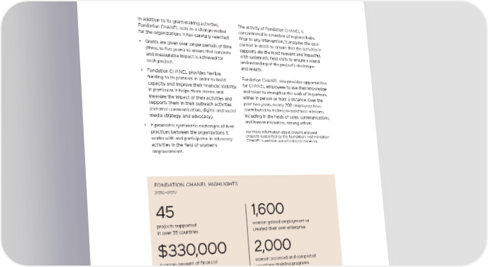 ADVANCING THE ROLE OF WOMEN IN SOCIETY In addition to its grant-making activities, The activity of Fondation CHANEL is Fondation CHANEL acts as a change-maker concentrated in a number of regional hubs. for the organizations it has carefully selected: Prior to any intervention, it analyzes the local • Grants are given over longer periods of time context in detail to ensure that the activities it (three to five years) to ensure that concrete supports are the most relevant and impactful, and measurable impact is achieved for with systematic field visits to ensure a sound each project. understanding of the project’s challenges and results. • Fondation CHANEL provides flexible funding to its partners in order to build Fondation CHANEL also provides opportunities capacity and improve their financial stability. for CHANEL employees to use their knowledge In particular, it helps them assess and and talent to strengthen the work of its partners, measure the impact of their activities and either in person or from a distance. Over the supports them in their outreach activities past two years, nearly 200 employees have (external communication, digital and social contributed to technical-assistance missions, media strategy, and advocacy). including in the fields of sales, communications, and human resources, among others. • It promotes systematic exchanges of best practices between the organizations it For more information about present and past works with and participates in advocacy projects supported by the foundation, visit Fondation CHANEL’s website: www.fondationchanel.org activities in the field of women’s empowerment. FONDATION CHANEL HIGHLIGHTS 2016–2017 45 1,600 projects supported women gained employment or in over 35 countries created their own enterprise $330,000 2,000 Average amount of financial women accessed and completed support per project vocational training programs 3–5 years 60,000 Average duration women benefitted from improved of partnerships access to health services