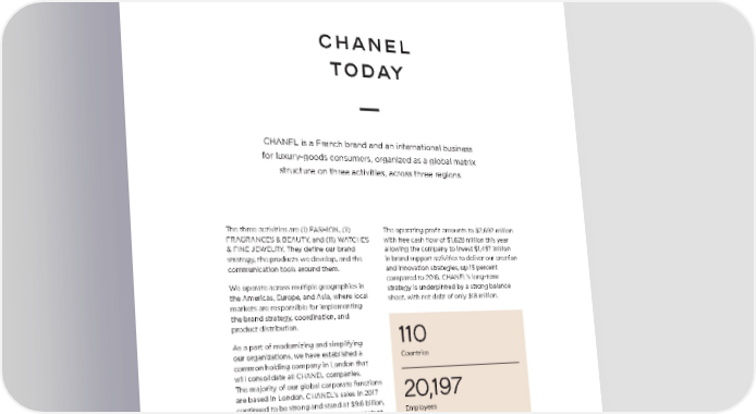 INTRODUCTION CHANEL TODAY CHANEL is a French brand and an international business for luxury-goods consumers, organized as a global matrix structure on three activities, across three regions. The three activities are (i) FASHION, (ii) The operating profit amounts to $2,692 million FRAGRANCES & BEAUTY, and (iii) WATCHES with free cash flow of $1,628 million this year & FINE JEWELRY. They define our brand allowing the company to invest $1,457 million strategy, the products we develop, and the in brand support activities to deliver our creation communication tools around them. and innovation strategies, up 15 percent compared to 2016. CHANEL’s long-term We operate across multiple geographies in strategy is underpinned by a strong balance the Americas, Europe, and Asia, where local sheet, with net debt of only $18 million. markets are responsible for implementing the brand strategy, coordination, and product distribution. 110 As a part of modernizing and simplifying our organizations, we have established a Countries common holding company in London that will consolidate all CHANEL companies. The majority of our global corporate functions are based in London. CHANEL’s sales in 2017 20,197 continued to be strong and stand at $9.6 billion, up 11 percent compared to 2016 on a constant Employees currency basis, with growth in all regions.