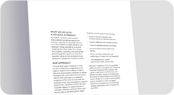 WHAT WE BELIEVE: Fondation CHANEL promotes the following: A HOLISTIC APPROACH • Access to economic resources and At CHANEL, we believe that women’s entrepreneurship (including microfinance). empowerment and gender equality are • Access to education and vocational training. not only a question of equal rights, but are also a key condition to global progress and • Access to leadership and decision-making. represent a huge opportunity for growth • Access to health and social protection and prosperity. Many studies have shown services. that societies, companies, and communities promoting gender equality are more free, • The use of culture, information, and peaceful, stable, and fair, and lead to more technology as a means for social integration. 2 prosperous and dynamic economic models. • The strengthening of women’s OUR APPROACH organizations, funds, and networks. For over seven years, Fondation CHANEL Since 2011, Fondation CHANEL has expanded has been committed to supporting social significantly. Since its inception, it has supported purpose organizations working to improve more than 60 projects in 35 countries, with the social and economic conditions of women a global commitment of $20.5 million. Over throughout the world. This mission resonates the next five years, we plan on investing over with CHANEL and leads to a systematic $120 million in advancing the role of women in integration of this issue into our work and society. Thanks to its concrete and measurable long-term vision. By giving grants to nonprofit impact, Fondation CHANEL has gained organizations, Fondation CHANEL provides international recognition in its field through long-term support to women and girls in strategic partnerships with UN Women and vulnerable situations and helps them reach the OECD. the first step on the development ladder. 2. For example, the McKinsey Global Institute Report, September 2015, “The power of parity: How advancing women’s equality can add $12 trillion to the global economy.”