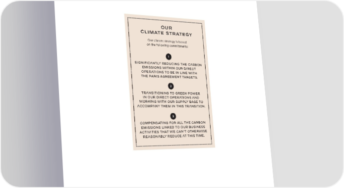 OUR CLIMATE STRATEGY Our climate strategy is based on the following commitments: 1 SIGNIFICANTLY REDUCING THE CARBON EMISSIONS WITHIN OUR DIRECT OPERATIONS TO BE IN LINE WITH THE PARIS AGREEMENT TARGETS. 2 TRANSITIONING TO GREEN POWER IN OUR DIRECT OPERATIONS AND WORKING WITH OUR SUPPLY BASE TO ACCOMPANY THEM IN THIS TRANSITION. 3 COMPENSATING FOR ALL THE CARBON EMISSIONS LINKED TO OUR BUSINESS ACTIVITIES THAT WE CAN’T OTHERWISE REASONABLY REDUCE AT THIS TIME.
