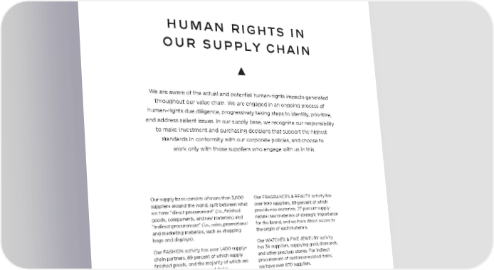 A HUMAN-DRIVEN COMPANY HUMAN RIGHTS IN OUR SUPPLY CHAIN We are aware of the actual and potential human-rights impacts generated throughout our value chain. We are engaged in an ongoing process of human-rights due diligence, progressively taking steps to identify, prioritize, and address salient issues. In our supply base, we recognize our responsibility to make investment and purchasing decisions that support the highest standards in conformity with our corporate policies, and choose to work only with those suppliers who engage with us in this. Our supply base consists of more than 3,000 Our FRAGRANCES & BEAUTY activity has suppliers around the world, split between what over 900 suppliers, 69 percent of which we term “direct procurement” (i.e., finished provide raw materials. 27 percent supply goods, components, and raw materials) and natural raw materials of strategic importance “indirect procurement” (i.e., sales, promotional for the brand, and we have direct access to and marketing materials, such as shopping the origin of such materials. bags and displays). Our WATCHES & FINE JEWELRY activity Our FASHION activity has over 1,400 supply- has 34 suppliers, supplying gold, diamonds, chain partners, 69 percent of which supply and other precious stones. For indirect finished goods, and the majority of which are procurement of customer-related items, based in Europe (France and Italy). we have over 670 suppliers.
